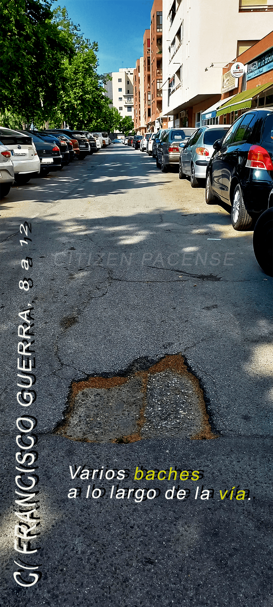 Varios baches en la vía Francisco Guerra del 8 al 12. Se solicita asfaltar la vía y señalizar las plazas de aparcamiento.