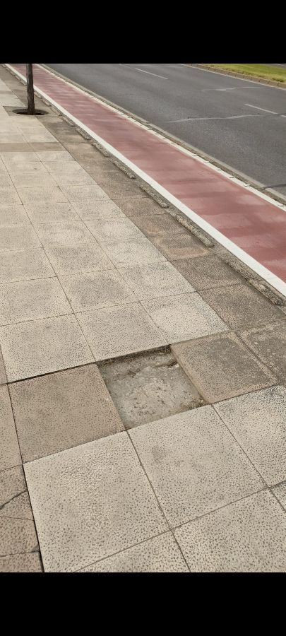 Hola, es necesario arreglar esa acera sin baldosa. El domingo por la mañana me hice un esguince en el tobillo de primer grado al ir corriendo y pisar justo en ese punto. Es importante que se arregle cuanto antes para que no le pase lo mismo a los abuelos que este paseando