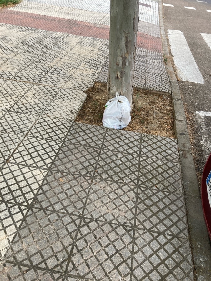 Otro cívico pacense que olvida su bolsa de basura. Agradeceríamos diesen el aviso para su retirada. Gracias