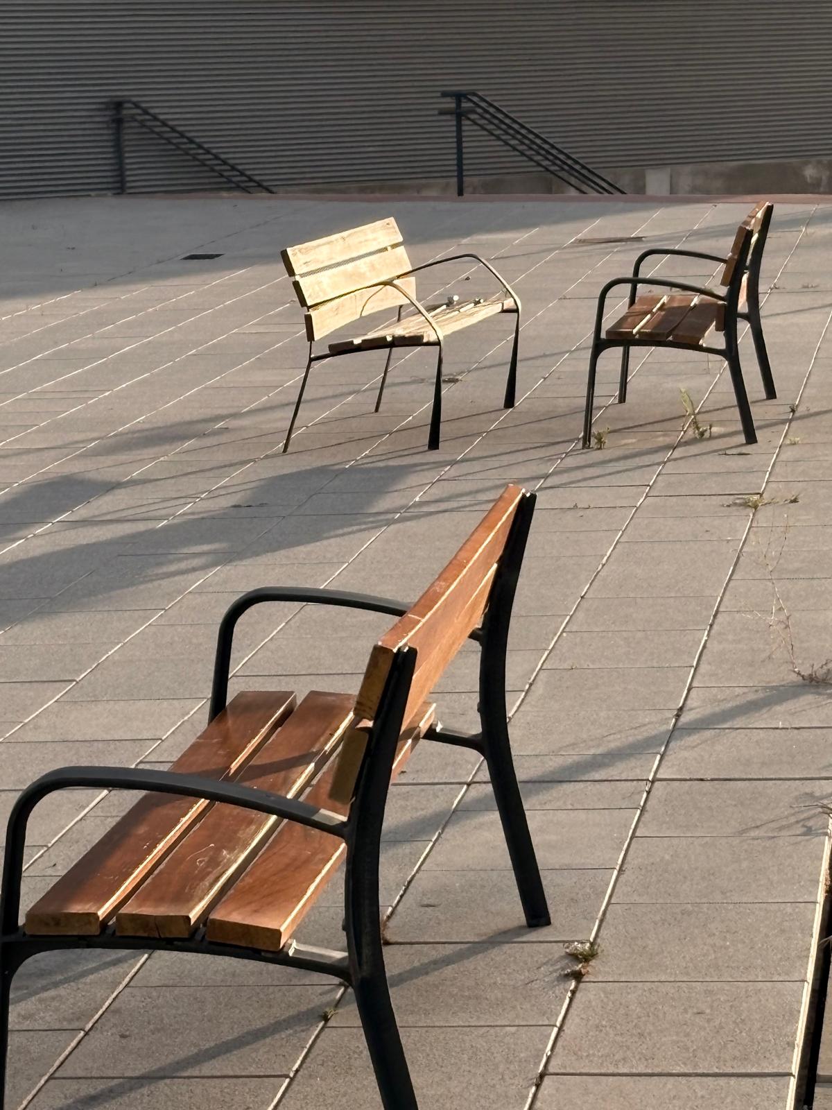 Hay un banco totalmente roto, pero también hay dos que se mueven mucho, están para caerse, en muy malas condiciones.