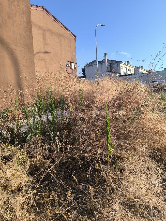 Estimado Ayuntamiento de Badajoz: Solicito la limpieza y desbroce urgente del terreno mostrado en la imagen, contiguo a adosados. La maleza alta y seca representa un riesgo de incendio, además de ser un foco potencial de plagas e insalubridad que afecta directamente a las viviendas y a la calidad de vida de las familias de esa calle. Agradezco su pronta intervención.