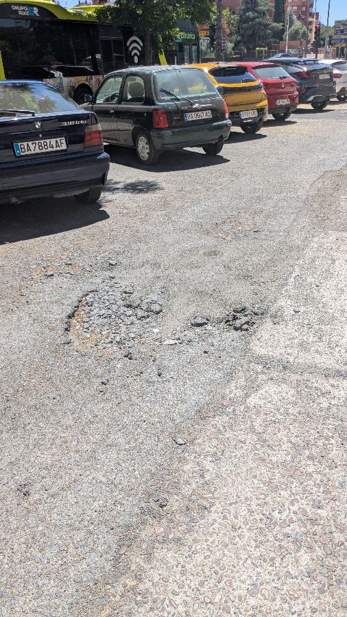 Son dos baches enfrente del restaurante Skakeo. Estuvieron de obras arreglando algún tipo de desperfecto y yo pensaba que lo iban a arreglar. No fue así. Lleva casi un año y cada vez es mayor