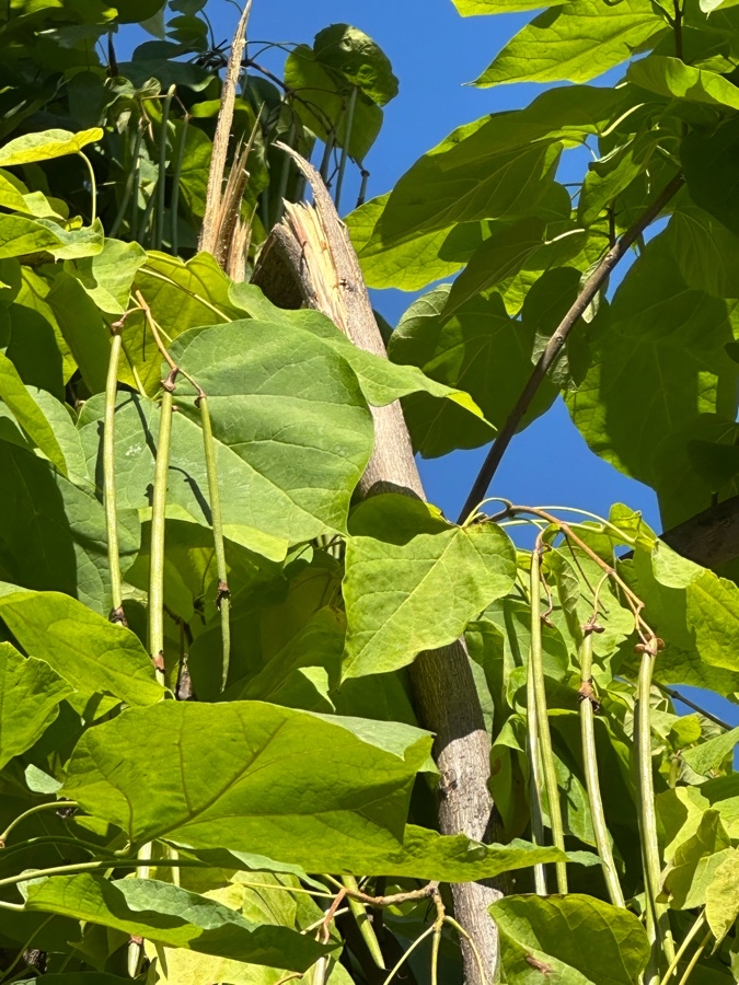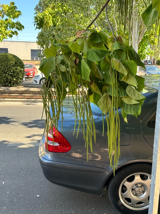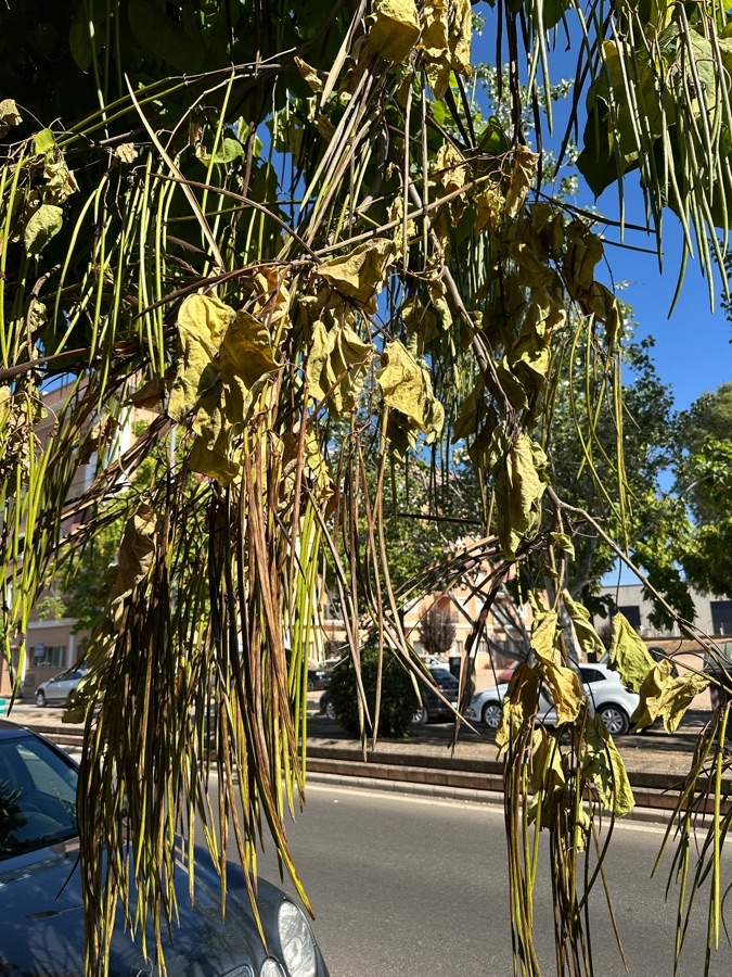 La Catalpa que está a la altura de la calle Castillo Puebla de Alcocer, 45, tiene una rama partida que es un peligro potencial para viandantes y coches. Además, hay otras ramas, a punto de partirse, que están ya a menos de un metro del suelo.