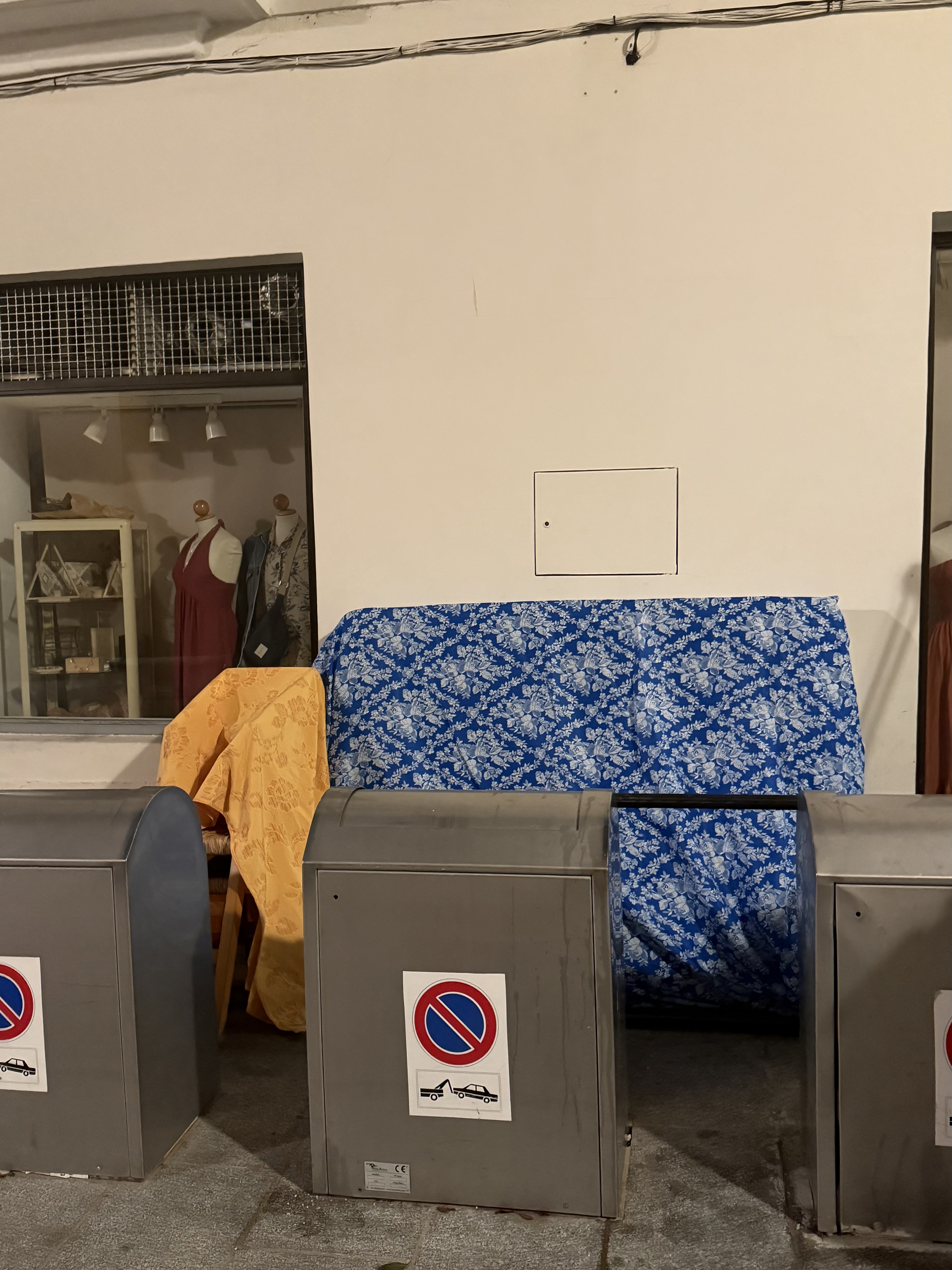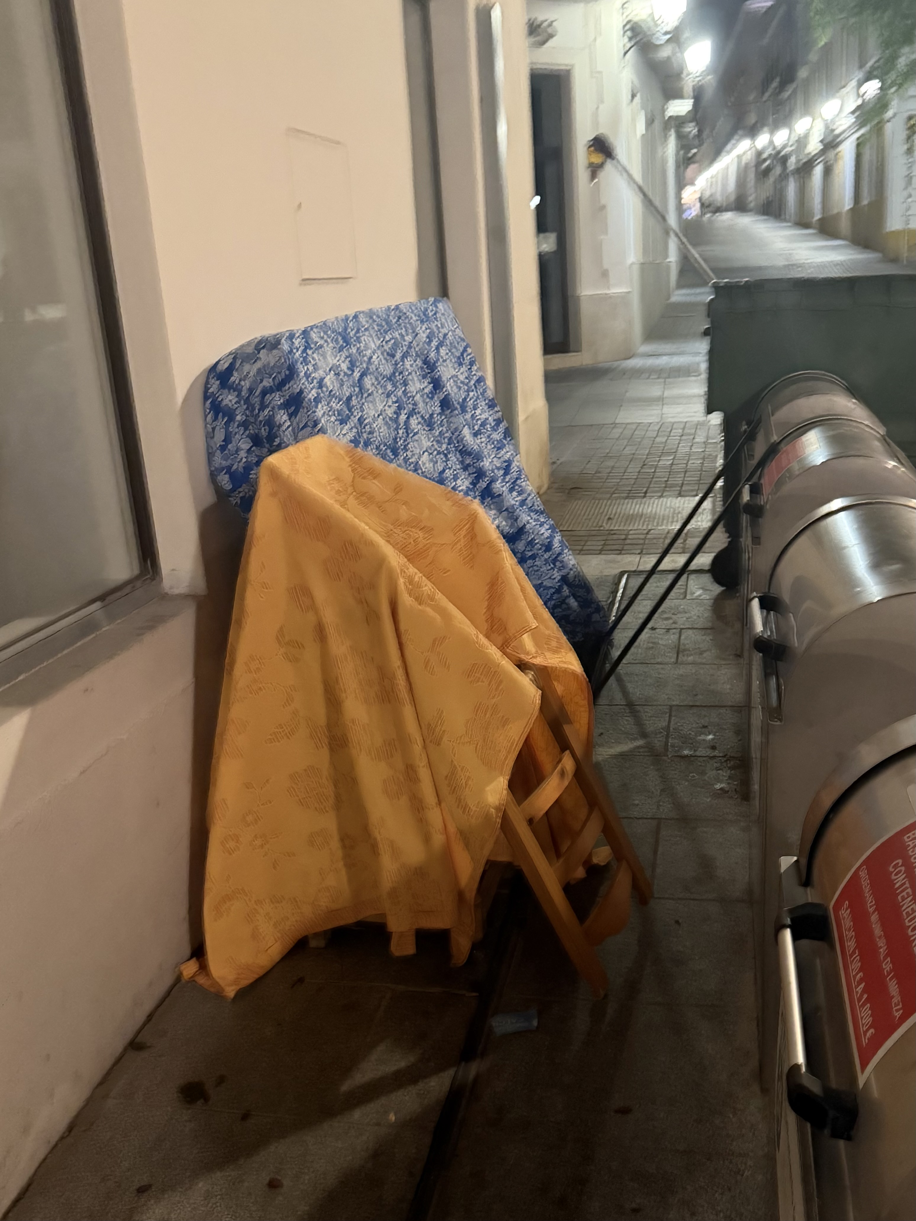 Basura apoyada en fachada de vivienda y negocio. Suciedad.