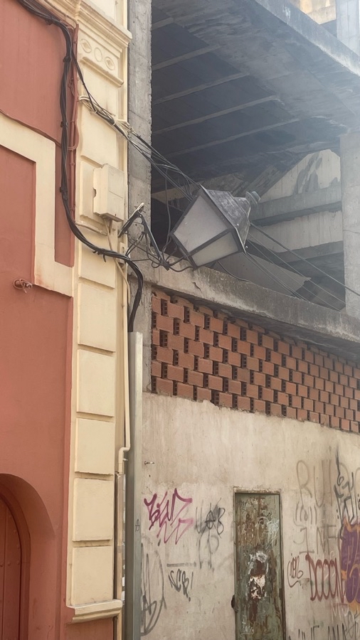 Hay una farola que se ha descolgado de su anclaje que pende solo de una tuerca