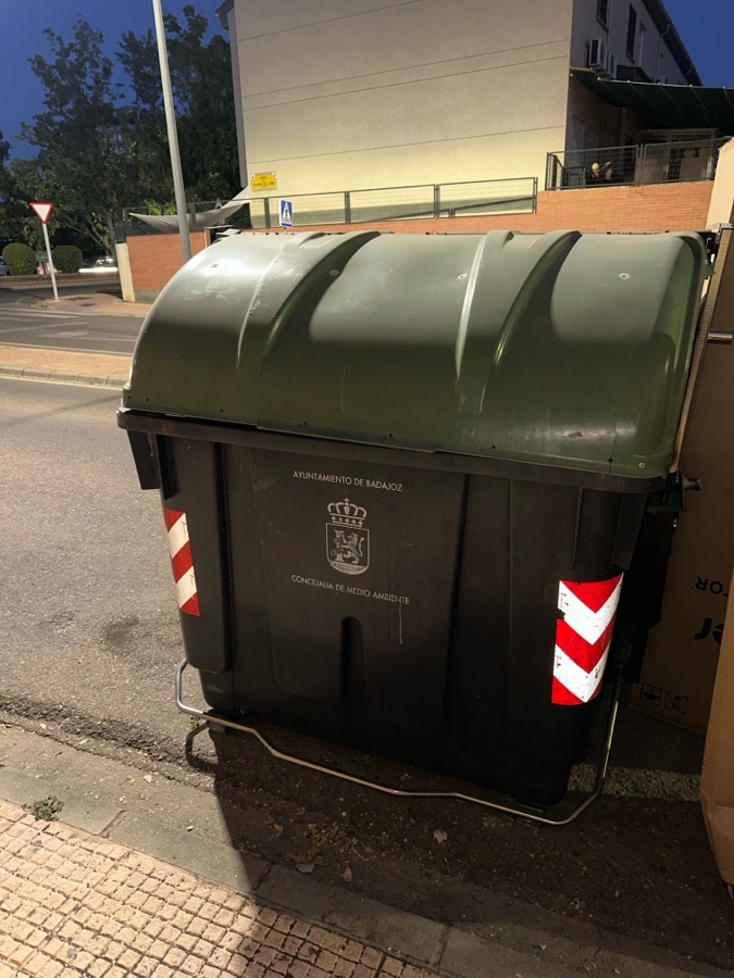 El contenedor de la calle castillo de Villagarcia De la Torre, cruce con Castillo Puebla de Alcocer, tiene la palanca de apertura estropeada.