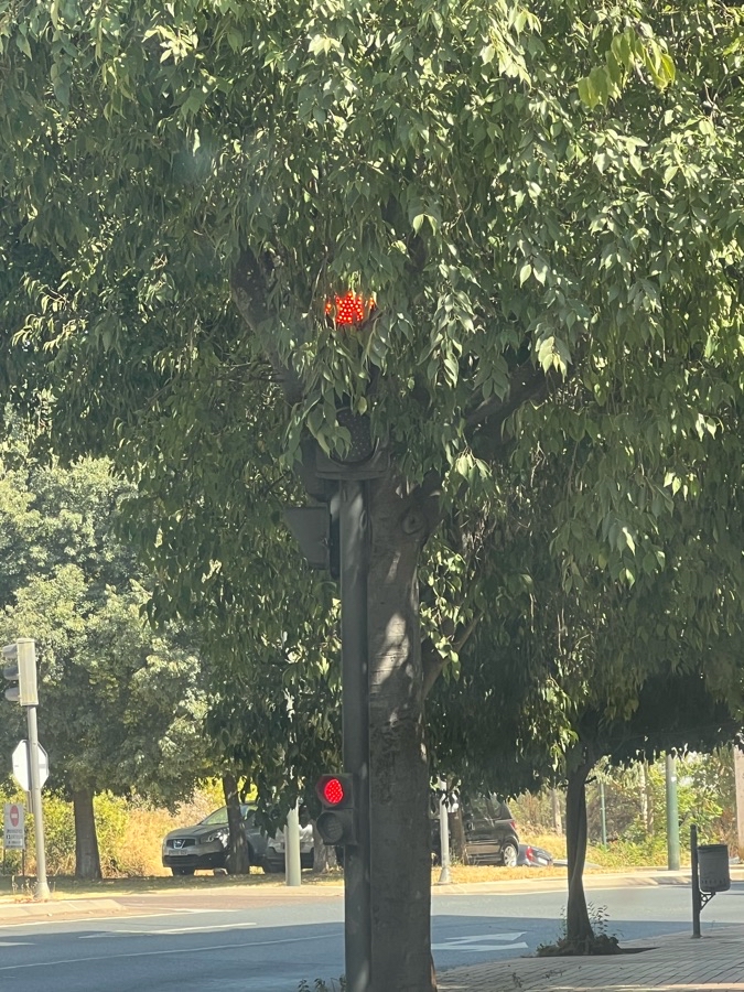Está tan lleno de las hojas de los árboles que no se ve el semáforo