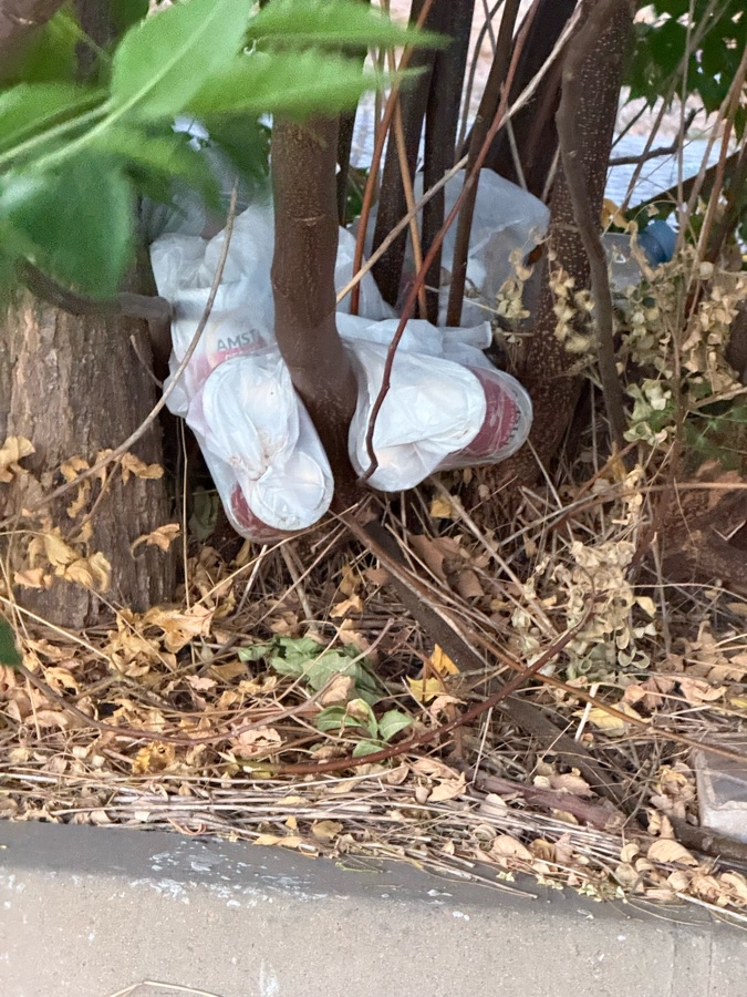 Al final de Pedro Pirfano Zambrano, justo en frente de la nueva construcción se encuentra este árbol que obstaculiza por completo el paso por la acera (el de al lado va por el mismo camino) Además está lleno de bolsas con latas. Un foco de todo…