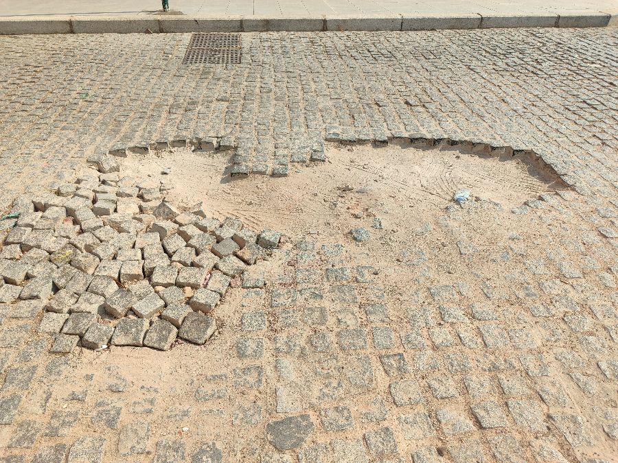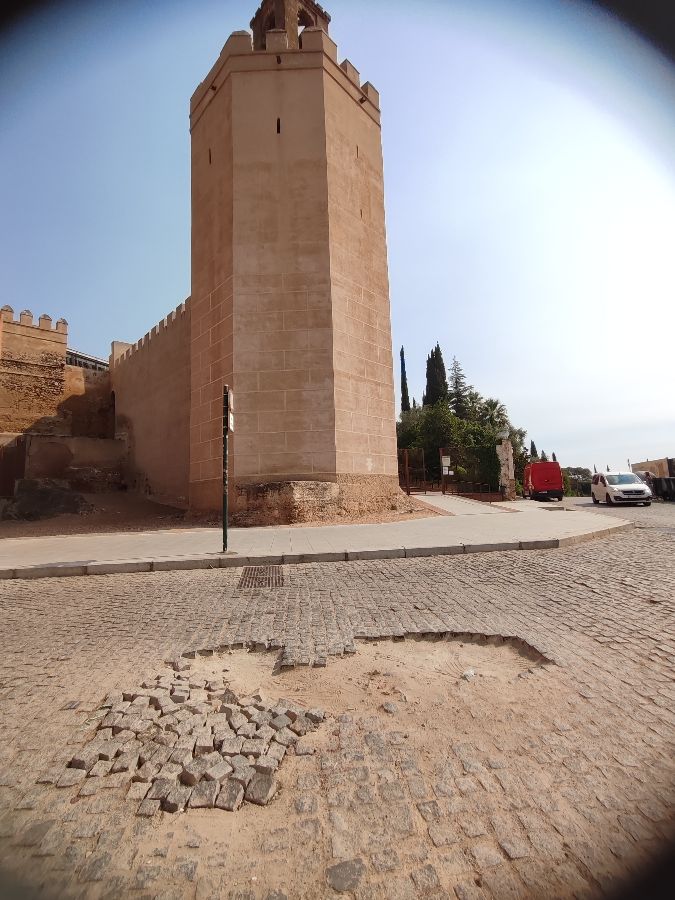 Frente a la torre de Espantaperros hay un gran agujero faltan un montón de adoquines,ya no solo es el trastorno sino la malísima imagen que dejamos ante uno de los monumentos de la ciudad y al lado de los jardines de la Galera que están siendo promocionados este verano. Ruego actúen con urgencia.