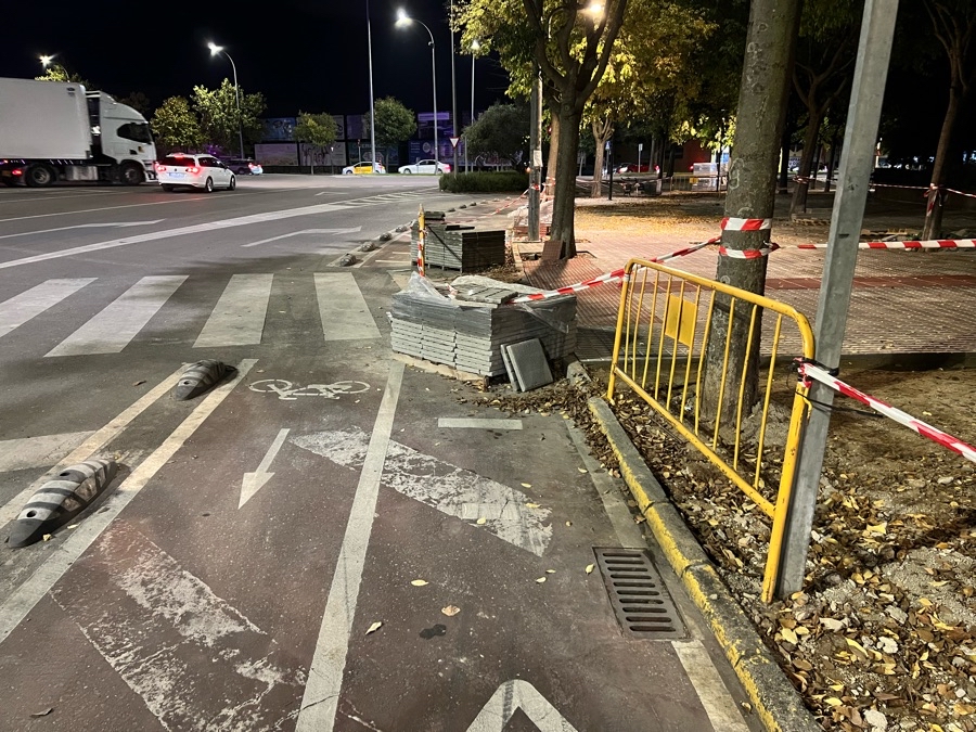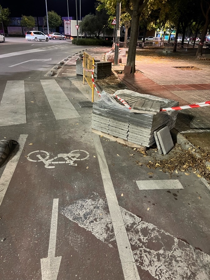 Se están renovando los acerados de Sinforiano a nivel de la rotonda de la carretera de Olivenza y están usando el carril bici para almacenar las baldosas obstruyendo el paso y obligando a las bicicletas a pasar en dirección prohibida por los carriles de vehículos motorizados