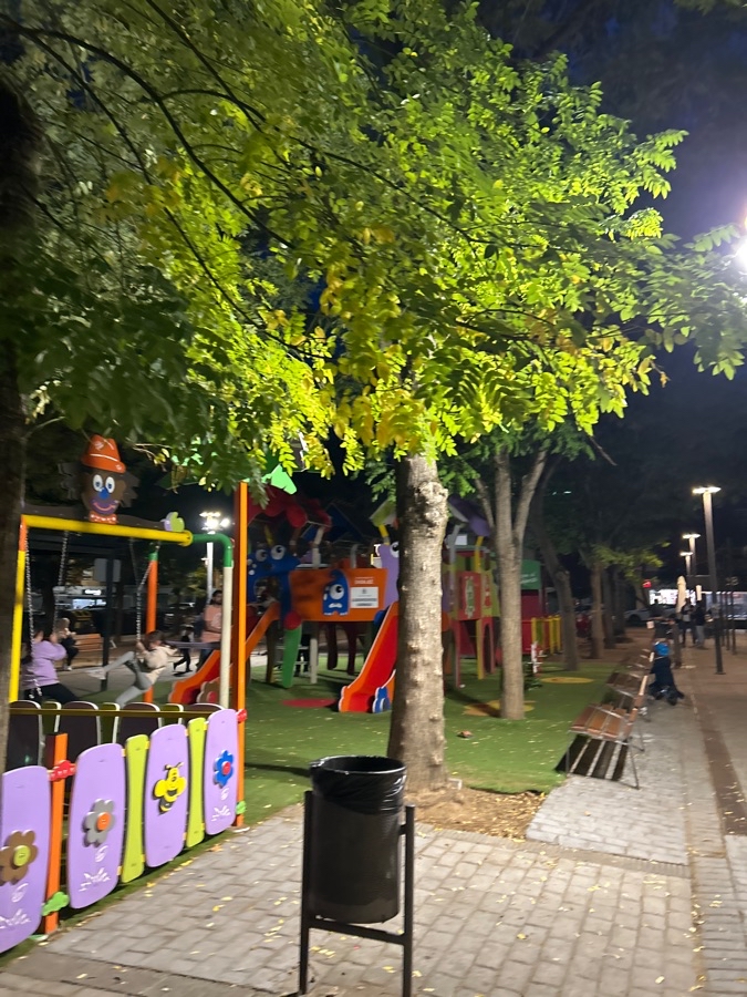 Parque de trenecito sin iluminación debido a los árboles. Se instalaron focos pero ahora hay muchas ramas que cortan la proyección de la luz
