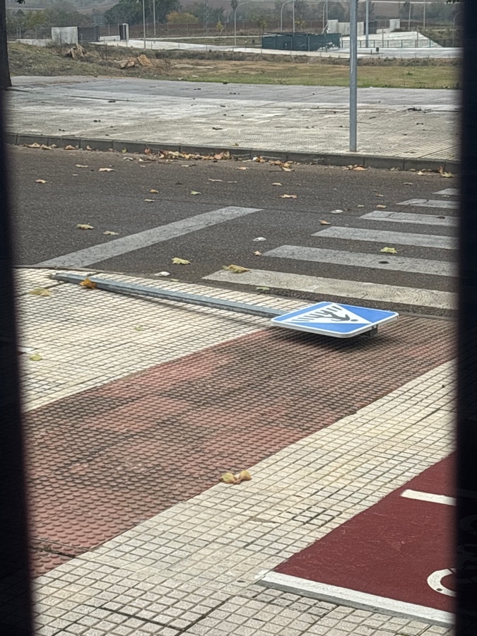 En la calle Juan de Ávalos esquina con calle Antonio Covarsí Rojas está la señal de paso de peatones caída, lleva más de una semana en el suelo
