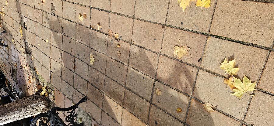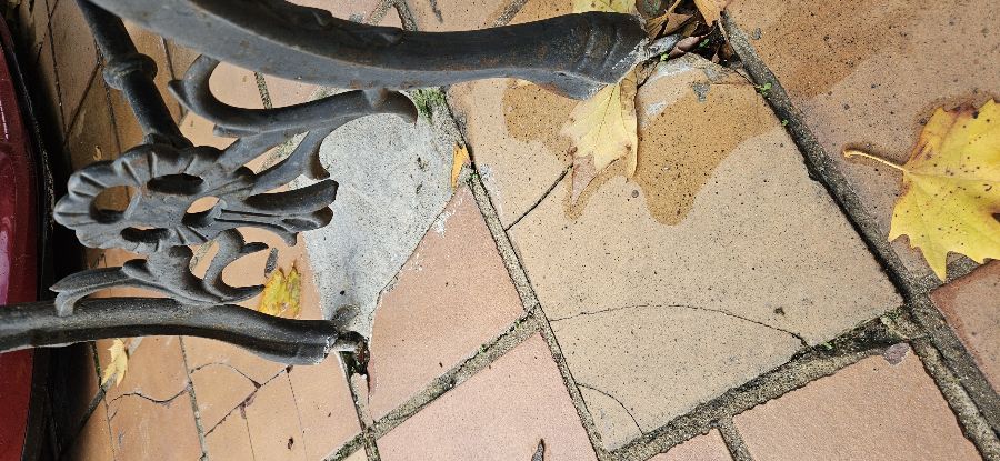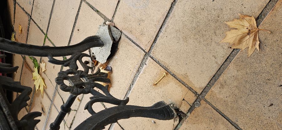 Banco arrancado de su ubicación por impacto de vehículo y pavimento destrozado con peligro para personas (ya ha causado inciente de caída de peatón) en acerado de Centro Comercial Las Vaguadas, frente a entrada de farmacia y cerrajería.