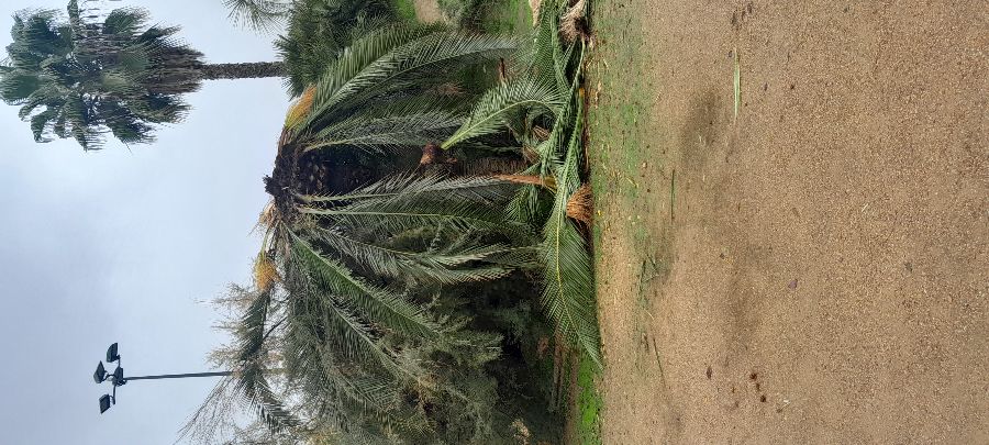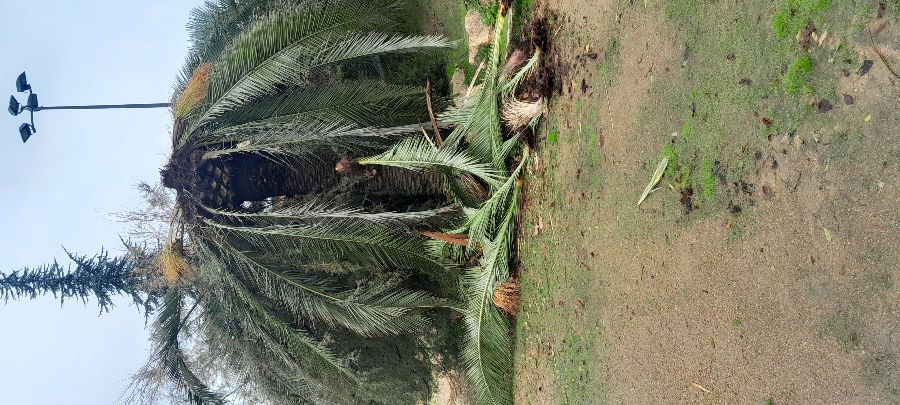Palmera en mal estado con varias hojas caidas en el suelo