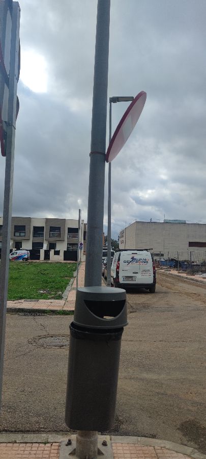 A esta señal, ubicada en una farola, o se le ha caído o le han roto el agarre superior con posibilidad de caída en la vía pública ya que el agarre inferior está oxidado