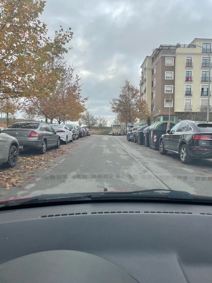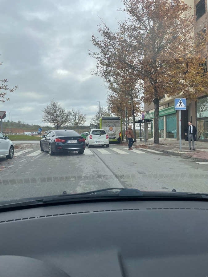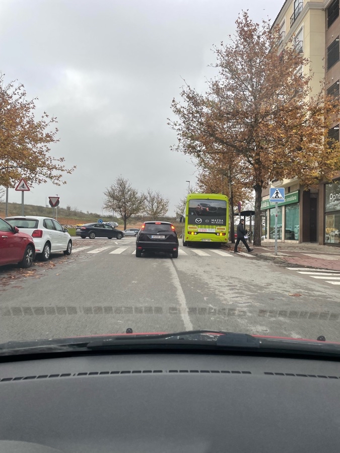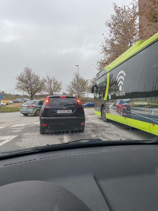 Gravísimo riesgo para vehículos y peatones. Ocupa carril de marcha. Zona próxima óptima para nueva parada.