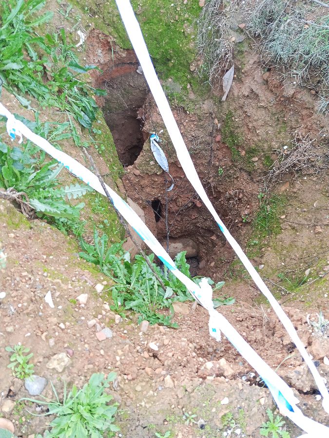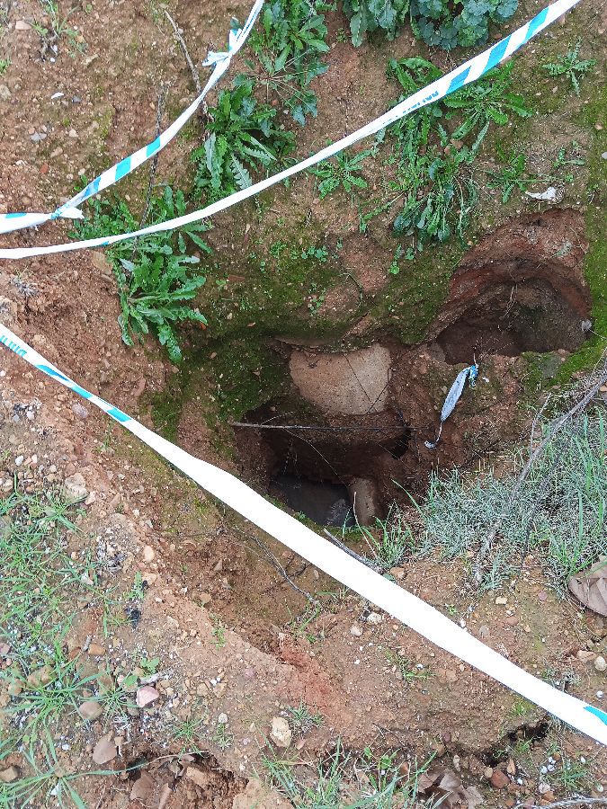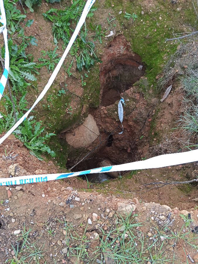 Hace más de tres meses se identifico un socavón de 3 o más metros de profundidad. Con riesgo a personas y animales. Fue acordonado por la policía local de forma chapucera. Es un peligro