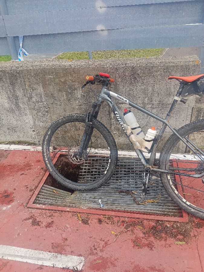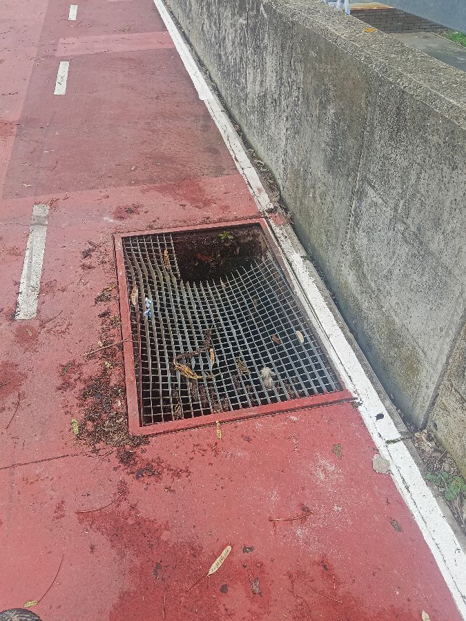 En carril bici al lado de piscina climatizada, rejilla rota con riesgo de hundimiento y lesiones